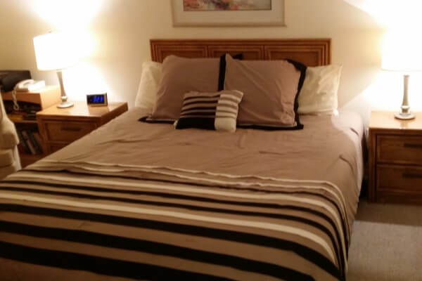 The master bedroom has wall-to-wall carpeting like the living area and features a king size bed with night stands, a dresser, a small desk for handling your correspondence, an easy chair and a second (cable) TV with remote. Adjacent is the tiled master bathroom (full tub) and a walk-in closet which also holds spare linens.